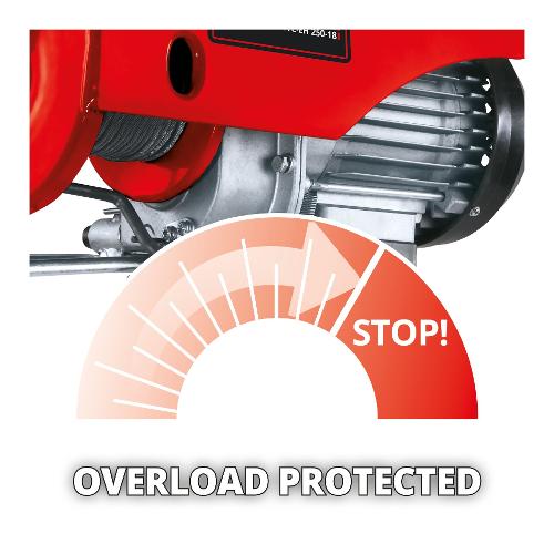 L'argano einhell tc-eh 500-18 consente di sollevare comodamente e delicatamente carichi pesanti in casa, in giardino, in garage o in officina. Basterà semplicemente premere un pulsante e l'argano solleverà carichi fino a 500 chilogrammi, con una potenza assorbita di 1.000 watt. L'argano einhell tc-eh 500 è dotato di un cavo da 18 metri a prova di torsione (ø 4,0 mm). Senza il rullo di guida, la portata di carico massima viene dimezzata a 250 chilogrammi ad un'altezza di 18 metri. Invece, con il rullo di guida è possibile sollevare carichi fino a 500 chilogrammi ad un'altezza di 9 metri. L'argano elettrico dispone di molti dispositivi di sicurezza. Per questo motivo, l'interruttore di comando è dotato della funzione di arresto d’emergenza. Il motore è equipaggiato con un interruttore termostatico che lo protegge dal surriscaldamento. Il dispositivo di sicurezza incluso sul gancio di sollevamento aiuta a prevenire la caduta accidentale del carico. Inoltre, un freno automatico fissa il carico in qualsiasi posizione. Lo spegnimento automatico del dispositivo a finecorsa assicura che l'argano venga spento in modo sicuro fino a raggiungere la sua posizione finale. Per il fissaggio dell'argano, sono previsti due morsetti doppi. La velocità di sollevamento con il rullo di guida è di 4 m/min e senza rullo di guida raggiunge gli 8 m/min.