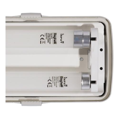Plafoniera stagna IP65 con tubi LED di ultima generazione inclusi. Il corpo in policarbonato è stato progettato per resistere alle sollecitazioni più gravose, la guarnizione siliconica e i ganci di chiusura in Nylon rinforzato, garantiscono il grado di protezione IP65. Gli aspetti illuminotecnica sono di tutto riguardo, i tubi LED ad alta efficienza riescono ad fornire il massimo delle prestazioni grazie al recuperatore di flusso integrato nel riflettore. Elevata resa luminosa e corpo dotato di guarnizioni in Poliuretano espanso antinvecchiamento. Ganci di serraggio in Nylon rinforzato fibra di vetro e staffe di fissaggio in acciaio ad interasse variabile per la massima praticità di installazione. Riflettore sagomato funzionale al recupero del flusso luminoso
