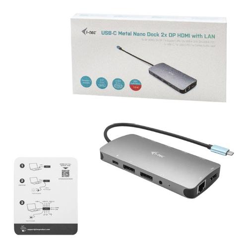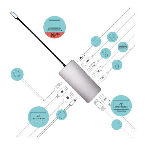 Una piccola docking station USB-C in metallo capace di collegare fino a tre monitor esterni*. Basta semplicemente collegare il vostro notebook o tablet (non è necessario installare i driver) e avrete una rapida trasmissione dati via USB, un collegamento a Internet attraverso la porta LAN con la possibilità di collegare le vostre cuffie e il microfono. Naturalmente il dispositivo supporta l’alimentazione del vostro notebook, fino a 100 W, questo significa che potrete caricare i vostri notebook e tablet che supportano l’alimentazione tramite USB-C (USB-C Power Delivery).