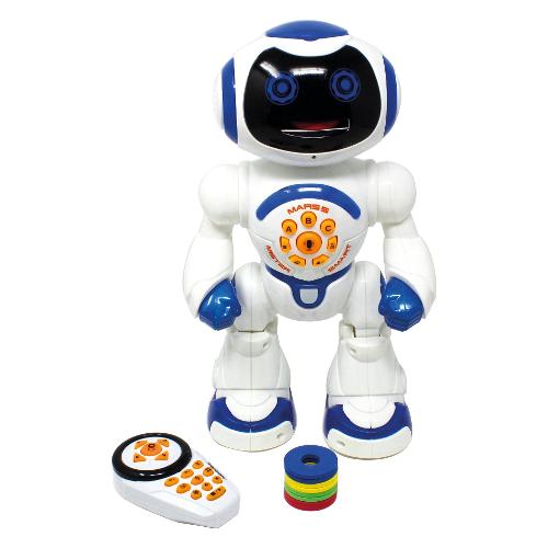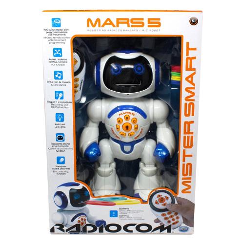 Robot radiocomandato con funzioni avanti indietro destra sinistra; racconta storie in italiano, fa domande, registra e riproduce, balla, spara dischetti in gommapiuma.