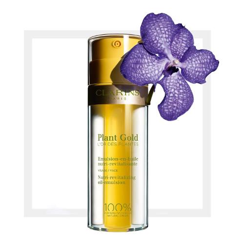 Fluido in olio nutriente e rivitalizzante viso, 100% di origine naturale. Ispirandosi ai gesti dei professionisti degli istituti, Clarins crea un innovativo doppio flacone dedicato a Plant Gold l'Oro delle piante. Una doppia formula inedita: l'iconico olio Huile Orchidèe Bleue Clarins e un'emulsione fondente si uniscono all'applicazione in una texture leggera e non grassa, conferendo alla pelle comfort, vitalità e luminosità. Utilizzare mattino e/o sera sul viso dopo la detersione. Applicare con leggere pressioni, scendendo su collo e dècolletè. Evitare il contorno occhi.