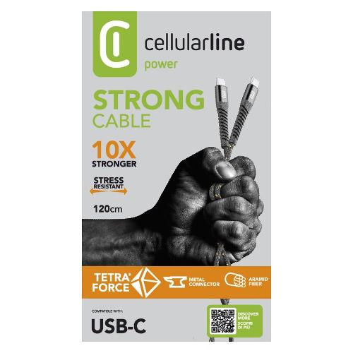 STRONG CABLE della linea TETRAFORCE è il cavo più resistente all'interno della gamma Cellularline. Il passacavo flessibile, allungato del 30% e dotato di Tecnologia Snake, è ultra-flessibile e resistente alle pressioni più estreme, protegge la parte più delicata del cavo garantendo fino a 30.000 flessioni – ovvero 10 volte in più rispetto un normale cavo standard. Strong Cable è realizzato con materiali progettati per assicurare la massima durabilità nel tempo: connettori in metallo per resistere a urti e pressioni, copertura del cavo con doppio intreccio in tessuto rinforzato per un'estrema flessibilità e robustezza del cavo, alloggiamento in lega d'alluminio, nucleo interno in rame ad alta purezza e fibra aramidica DuPont, Kevlar.