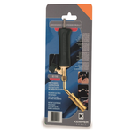 Cannello con bruciatore Ø 17 mm, prolunga curva di lunghezza 8 cm. Rubinetto con sistema di apertura a pressione e impugnatura gommata. Raccordo di entrata gas filettato 3/8" sinistro e portagomma Ø 8 mm. Ideale per lavori di saldobrasatura, stagnatura, sverniciare e termoretrarre.
