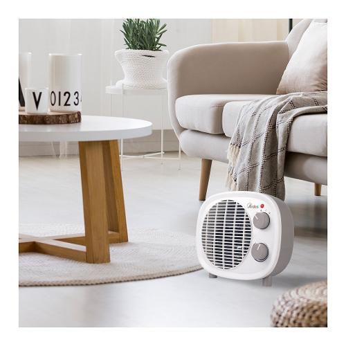 Termoventilatore. 2 livelli di potenza: eco e comfort. Ventilazione estiva. Termostato di regolazione della temperatura. Spia di funzionamento. Sistema di protezione anti surriscaldamento. Potenza 1700/2000W. Colore bianco/tortora. Resa 60 m3.