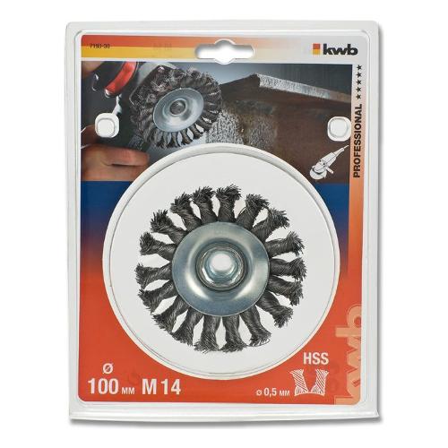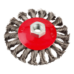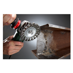 Spazzola conica, filo d’acciaio hss, intrecciato, piegata a gomito, per disossidare, rimuovere rivestimenti, colore, ruggine forte e protezione antiruggine, pulire saldature, disincrostare, sbavare, per metallo e pietra, per lavori su bordi stretti, telai, grate e superfici facilmente accessibili.