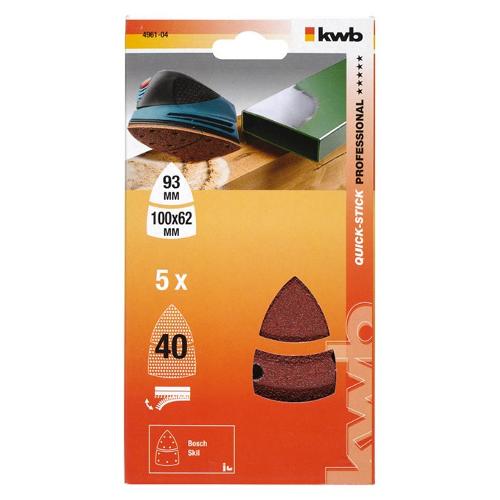 Triangoli abrasivi, legno & metallo, corindone pregiato, 100 x 62, 93 mm, con riporto di ossido di alluminio, legato con resina completamente sintetica, materiale di supporto rinforzato, con parte posteriore di velours, forato per levigatrici a delta, per levigare metallo e legno, colore, vernice, stucco, pietra e materia plastica.