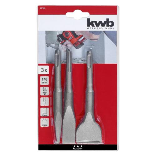 Serie di 3 scalpelli sds, serie di scalpelli corti per martello perforatore delle misure più comuni, lunghezza di tutti gli scalpelli: 140 mm, comprende 2 scalpelli piatti di 20 e 40 mm di larghezza per un´elevata asportazione di materiale e 1 scalpello a punta per lavori di adattamento, adatti a lavori scalpellatura di pietra e calcestruzzo, robusto acciaio al cromo con una durezza di hrc 45-48, con gambo sds plus adatto a tutti i martelli perforatori con arresto girevole e attacco sds plus, in blister a scorrimento.