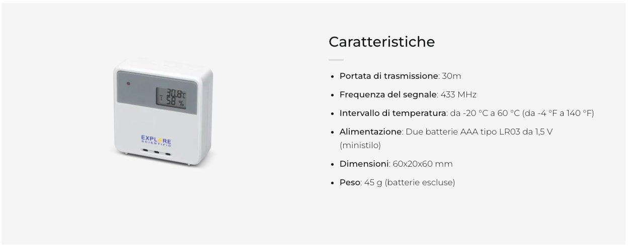 Il sensore esterno per la temperatura e l’umidità Explore Scientific ST1005 consente di ampliare le potenzialità di misura delle weather station WSH4009, RPW3008, RPW3009 e RDC8001. Può essere abbinato, come sensore aggiuntivo, a una stazione meteo anche per monitorare le variazioni termiche e igrometriche di un secondo ambiente interno, come un garage, una cantina o, semplicemente, una camera da letto. Si installa in pochi minuti, è alimentato a batteria e ha una portata massima di 30 metri (in assenza di ostacoli).