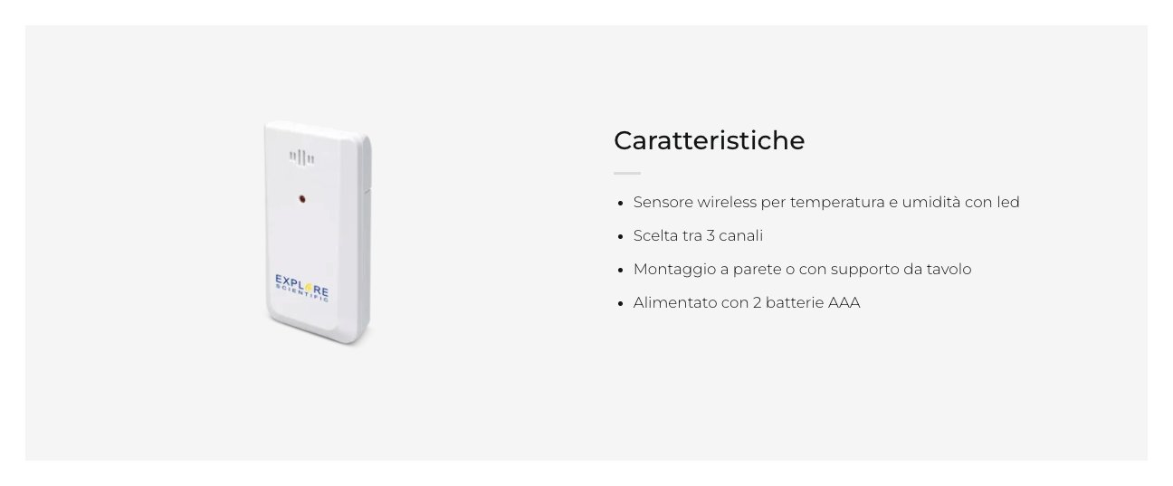 Il sensore esterno misura la temperatura e l’umidità relativa al luogo (interno o esterno) in cui viene posizionato, tra -20 °C e 60 °C (per la temperatura) e tra il 25% e il 95% (per l’umidità). Può trovarsi a un massimo di 30 metri dall’unità principale ed è alimentato da due batterie ministilo AAA (in dotazione). Compatibile con stazione meteo WSH4003, 4005C, 4008C. Supporta montaggio a parete o con supporto da tavolo.
