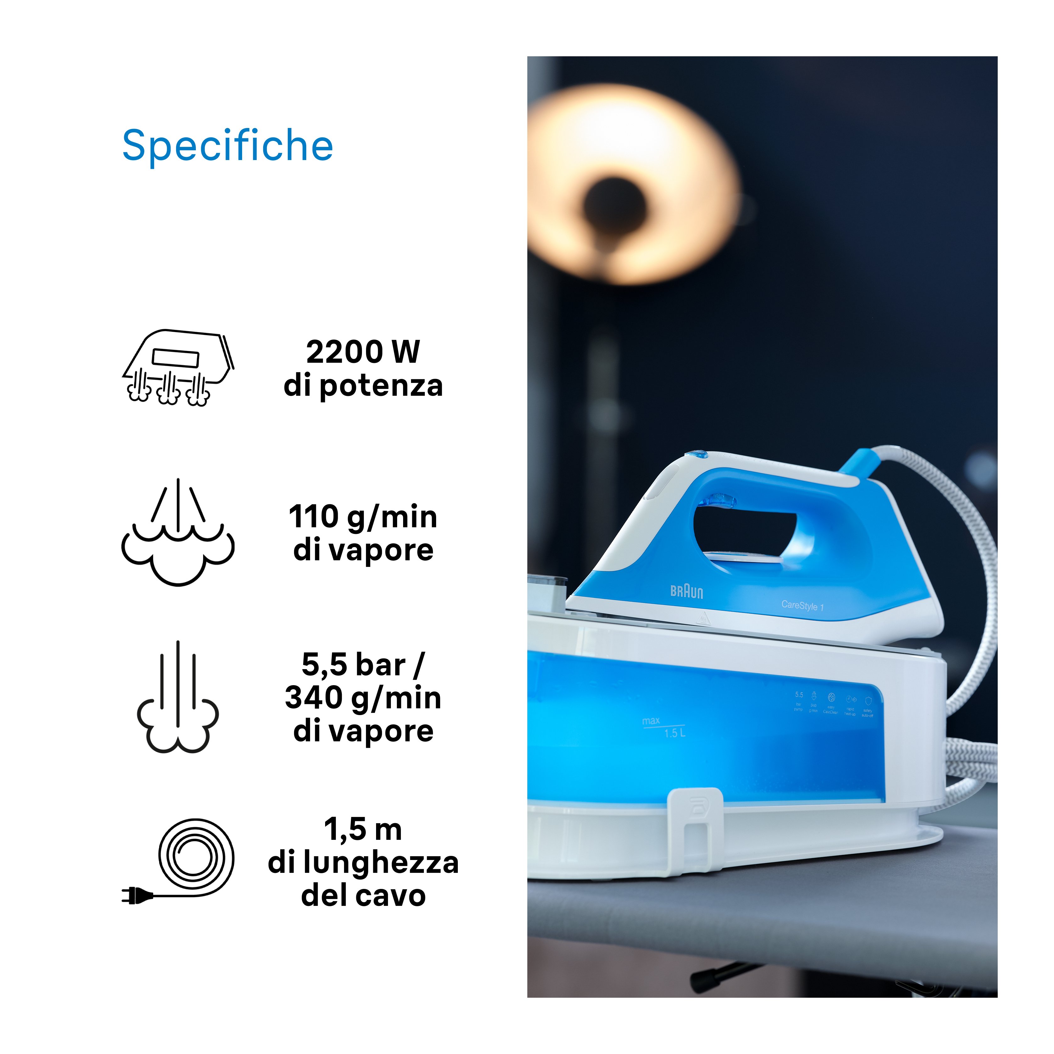 Il nuovo CareStyle 1 offre risultati di stiratura rapidi e immediati rispetto a un ferro da stiro a vapore tradizionale. Serbatoio dell'acqua rimovibile da 1,5L.