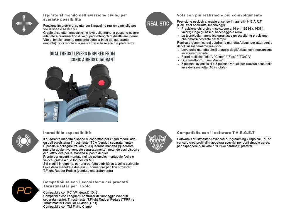 Scalda i tuoi motori con il primo quadrante manetta per aerei commerciali della gamma di prodotti Thrustmaster Civil Aviation (TCA) — compreso l’iconico pannello di controllo Airbus, per un’esperienza di volo ultra realistica!