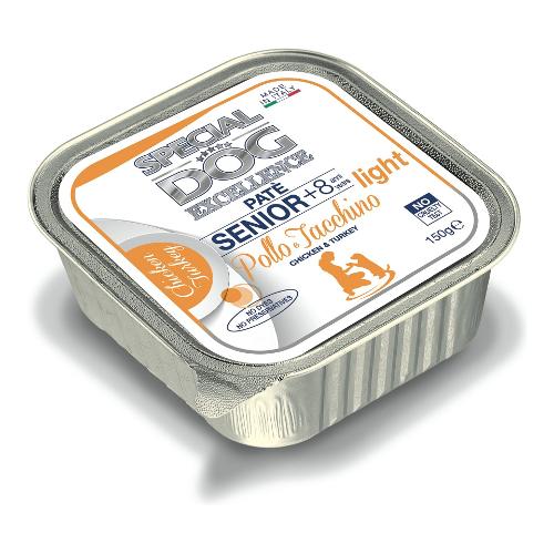 Il paté con pollo e tacchino senior light della linea special dog excellence è un alimento completo per cani in età avanzata, oltre gli 8 anni di età. Una deliziosa ricetta senza coloranti, conservanti e zuccheri aggiunti