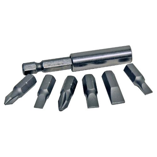 Valigetta, 10 punte da ferro (da 1,5 a 6 mm), 1 inserto porta bits, 6 bits per avviatore (PH1,PH2,PZ1,PZ2,5,6), 1 mini oliatore, 2 innesti rapidi 1/4” M, 1 boccetta olio