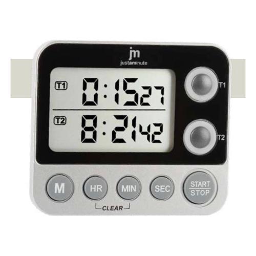Contaminuti al quarzo con possibilità di doppio conteggio. Funzioni: Timer (99h:59m:59s), Cronometro (99h:59m:59s), possibilità di memorizzare un tempo per ciascun timer. Allarme sonoro e visivo tramite apposita luce LED. Possibilità di 3 diverse applicazioni: su superficie metallica, tramite magnete; in appoggio; a parete.