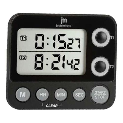 Contaminuti al quarzo con possibilità di doppio conteggio. Funzioni: Timer (99h:59m:59s), Cronometro (99h:59m:59s), possibilità di memorizzare un tempo per ciascun timer. Allarme sonoro e visivo tramite apposita luce LED. Possibilità di 3 diverse applicazioni: su superficie metallica, tramite magnete; in appoggio; a parete.