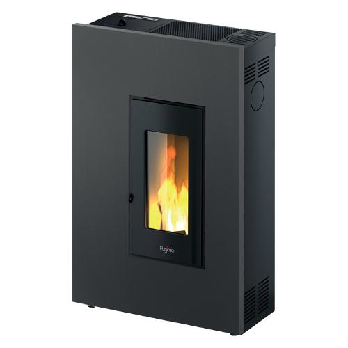 Stufa a pellet ad aria “salvaspazio” progettata e costruita appositamente per gli spazi ristretti della casa. Rivestimento in acciaio verniciato e porta in ghisa.