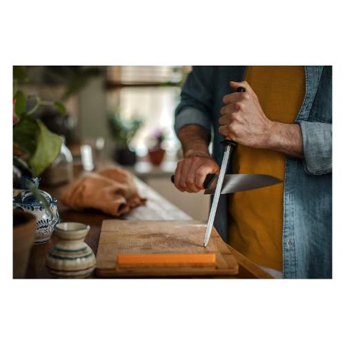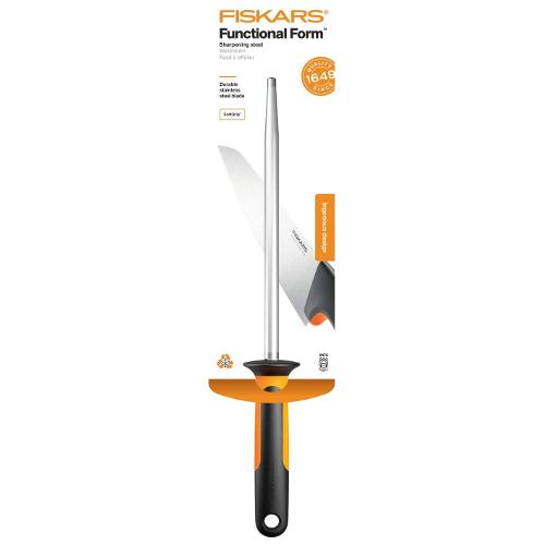 Acciaino per riaffilare e affilare coltelli e forbici - lunghezza ottimale di 33 cm per riaffilare coltelli da cucina di ogni tipo, far scorrere la lama dall'impugnatura alla punta, cote in acciaio spessa e di alta qualità - comoda impugnatura softgrip con protezione delle dita integrata per una presa salda e sicura, occhiello di sospensione per appenderlo facilmente - elevata durabilità grazie allo spesso acciaio inox, facile da pulire sotto acqua corrente, lavabile in lavastoviglie, design finlandese - contiene: 1x fiskars functional form acciaino, lunghezza: 33 cm, peso: 170 g, materiale: acciaio/plastica, colore: argento/nero/arancione