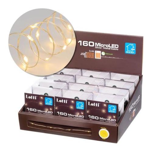 Catena lineare 16m 160 microled bianco caldo ø1,5mm, cavo metallo argento metal silver, memory controller integrato nel porta batterie luce fissa + 7 giochi di luce selezionabili + off, timer on-off 8-16 ore, a batteria 3xaa 1,5v, ip44 uso esterno e interno portatile, dimensioni 16m, scatola pvc color ed espositore pdq try me (xkc art. M160s-c t 3aa pdq).