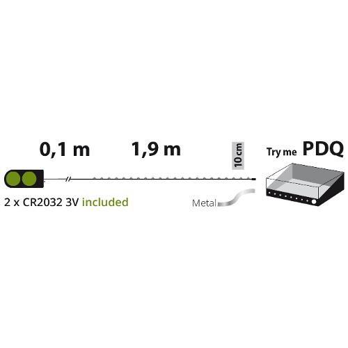 Catena lineare 2m 20 microled multicolor ø1,5mm, versione pdq, luce fissa, a batteria 2xcr2032 3v (incluse), micro porta batterie con selettore on-off, ip20 uso interno e portatile, cavo metallo argento metal silver, dimensioni 2m, scatola pvc color ed espositore pdq provami (xkc art. M20s cr2032 pdq).