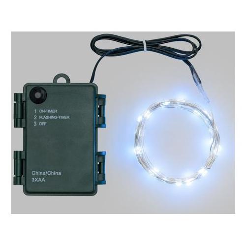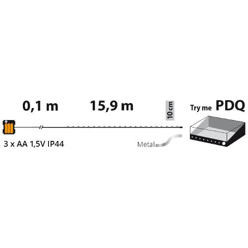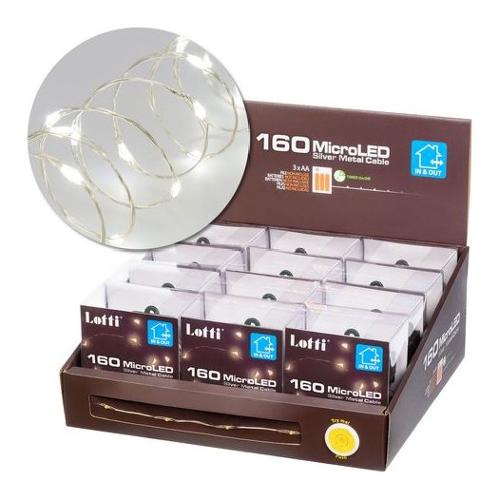Catena lineare 16m 160 microled bianco ø1,5mm, cavo metallo argento metal silver, memory controller integrato nel porta batterie luce fissa + 7 giochi di luce selezionabili + off, timer on-off 8-16 ore, a batteria 3xaa 1,5v, ip44 uso esterno e interno portatile, dimensioni 16m, scatola pvc color ed espositore pdq try me (xkc art. M160s-c t 3aa pdq).