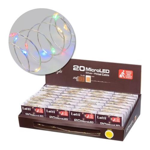Catena lineare 2m 20 microled multicolor ø1,5mm, versione pdq, luce fissa, a batteria 3xaa 1,5v, porta batterie con selettore on-off, ip20 uso interno e portatile, cavo metallo argento metal silver, dimensioni 2m, scatola pvc color ed espositore pdq provami (xkc art. M20s 3aa pdq).