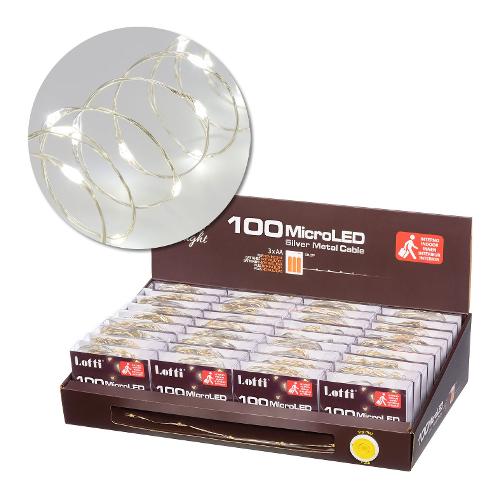 Catena lineare 10m 100 microled bianco ø1,5mm, versione pdq, luce fissa, a batteria 3xaa 1,5v, porta batterie con selettore on-off, ip20 uso interno e portatile, cavo metallo argento metal silver, dimensioni 10m, scatola pvc color ed espositore pdq provami (xkc art. M100s 3aa pdq).
