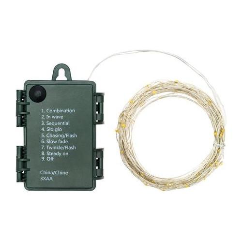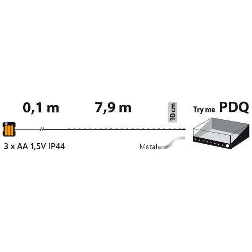 Catena lineare 8m 80 microled bianco ø1,5mm, cavo metallo argento metal silver, memory controller integrato nel porta batterie luce fissa + 7 giochi di luce selezionabili + off, timer on-off 8-16 ore, a batteria 3xaa 1,5v, ip44 uso esterno e interno portatile, dimensioni 8m, scatola pvc color ed espositore pdq try me (xkc art. M80s-c t 3aa pdq).