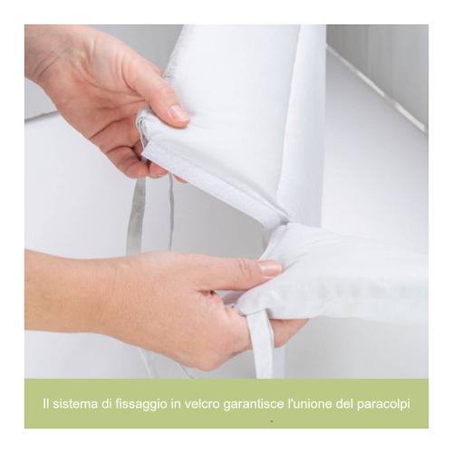 Il paracolpi lettino 4 lati è un supporto definito a sicurezza totale dagli urti per il bambino che dorme in un lettino con sponde. E' realizzato in tessuto 100% cotone certificato Oeko-Tex. L'imbottitura è in morbida fibra di poliestere traspirante da 400 grammi con spessore di 4 cm.Il paracolpo giroletto culla è adattabile alla maggior parte dei lettini in commercio, ripiegabile in 4 lati, misura 125x65x125x65, l'altezza della testata è di 50cm mentre i restanti 3 lati sono alti 40cm. Facile da fissare alle spondine grazie a ben 6 coppie di laccetti ed ad un supporto finale in velcro che ne aumenta la stabilità. Facilissimo da lavare! Va arrotolato su sé stesso, fissato con un laccio di stoffa e messo direttamente in lavatrice preferendo i programmi delicati a bassa centrifuga. Non utilizzare asciugatrice. Rigorosamente MADE IN ITALY