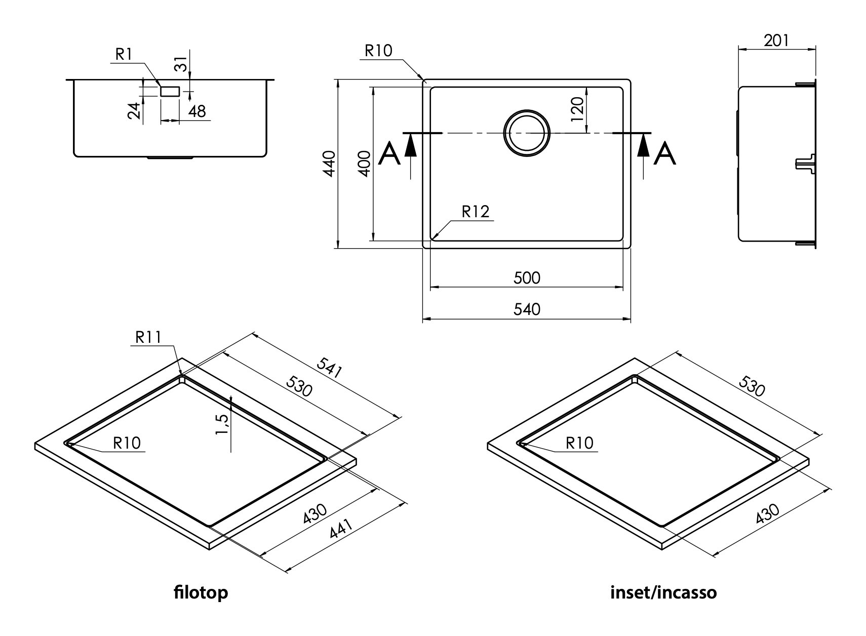 Lavello 1 vasca (54x44cm) RADIUS Inox Spazzolato LNR54FSFR