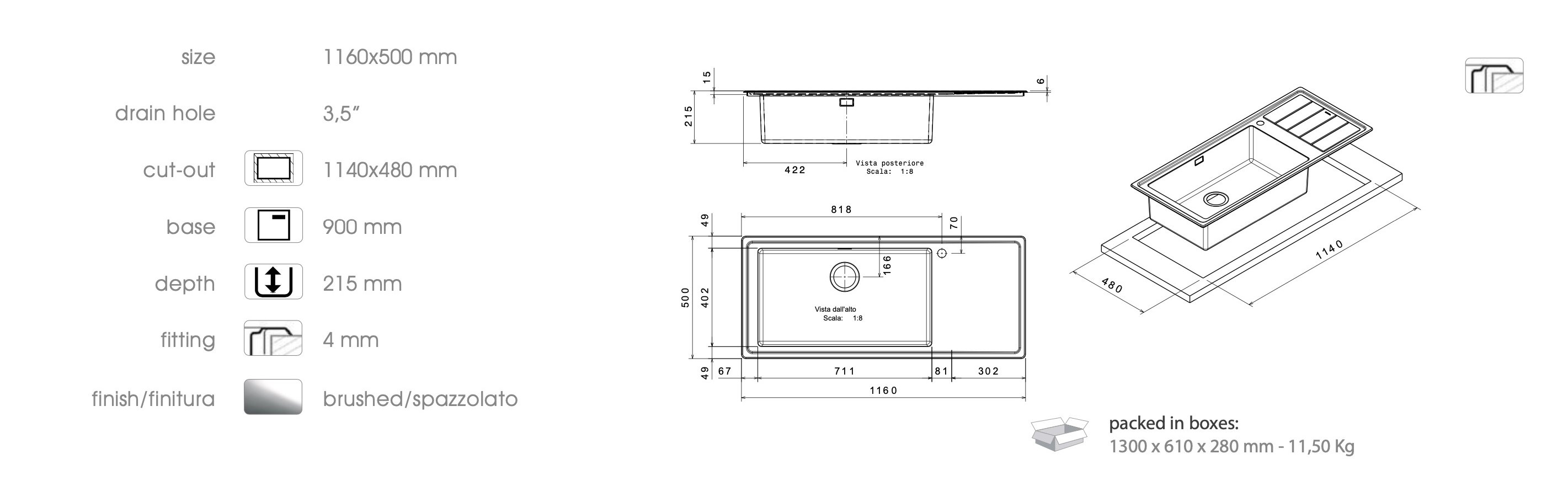 Lavello 1 vasca (116x50cm) LINEAR PLUS Inox Spazzolato LNPG1161ILBC