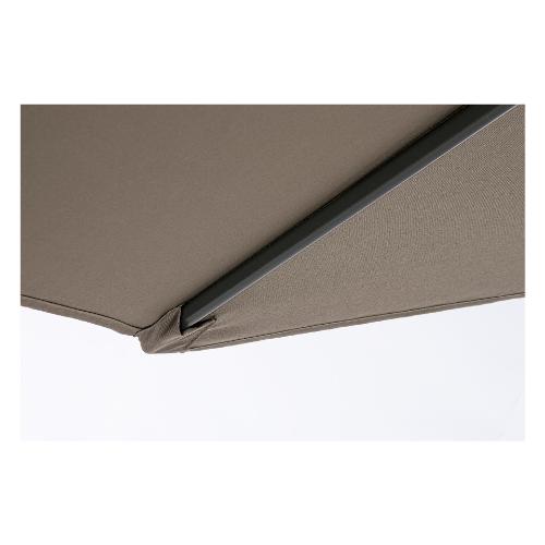 Struttura verniciata a polvere (Poliestere). Palo in alluminio Ø 36/38 mm con snodo. 6 stecche in acciaio trattato per esterno tramite fosfatazione 12x18 mm. Telo in Poliestere color tortora 160 gr/mq con camino antivento. Base non inclusa