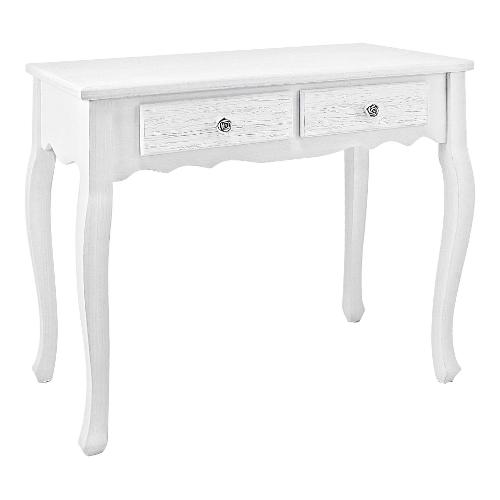 MDF. Finitura bianca opaca, frontali e piani con effetto decapato. Maniglie in poliresina