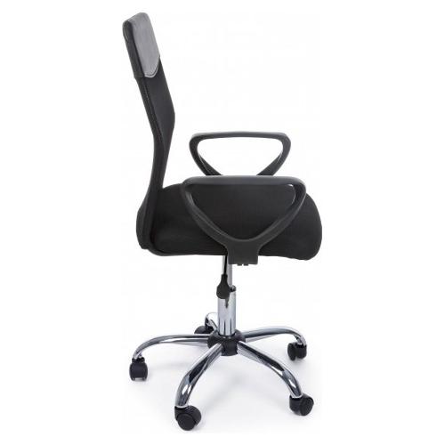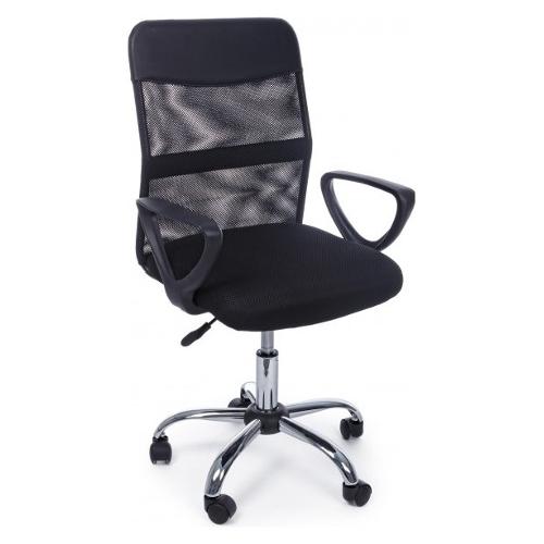 Base in acciaio cromato Ø 53 cm. Ruote in nylon. Seduta imbottita e rivestita in tessuto 100% Poliestere. Schienale rivestito in tessuto a rete 100% Poliestere con inserto in similpelle. Braccioli in plastica (pp). Altezza regolabile