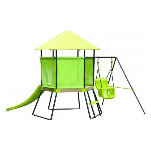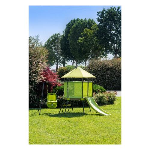 struttura e piedini in acciaio verniciato a polvere. asta orizzontale 28mm. gambe 22mm. 1 scala a pioli 1 scivolo (lunghezza 1,2m) 1 altalena. corda in pe, 10mm. tetto in polyestere (180 gr/m). recinzione in textilene 1x1. prodotto da assemblare. capacita' massima seduta bimbo: 15kg, per il resto della struttura 35kg 283a - 196b - 170h cm