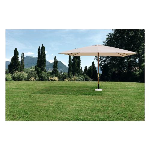 Struttura in legno. PaloØ 48mm in due pezzi, 6 stecche 13x23mm, connessioni in acciaio rivestito in ottone. Con carrucola. Telo naturale in Poliestere 180 gr/mq con camino antivento. Base non inclusa