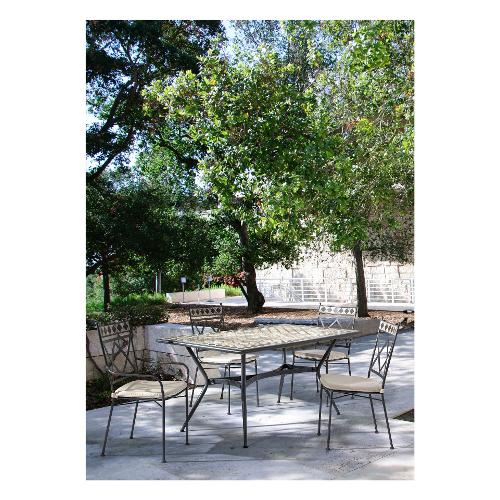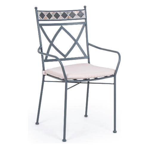 Struttura in acciaio trattato per esterno tramite zincatura e verniciato a polvere (Poliestere). Schienale con decoro in ceramica con lavorazione a mosaico. Cuscino sfoderabile in tessuto Poliestere
