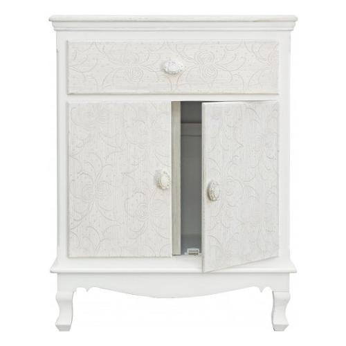 MDF. Ripiani e frontali con motivi floreali intarsiati. Rifinitura con vernice opaca a base d'acqua. Maniglie in poliresina