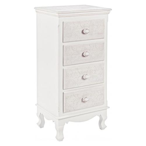 MDF. Ripiani e frontali con motivi floreali intarsiati. Rifinitura con vernice opaca a base d'acqua. Maniglie in poliresina