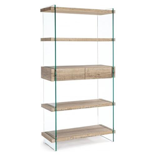 Mensole e cassetti in MDF rivestito con carta melaminica effetto legno. Fianchi in vetro temperato spessore 12 mm. Portata max mensola 2kg