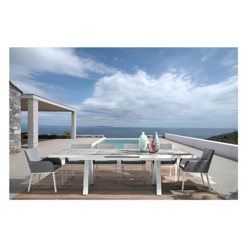 Struttura in alluminio verniciata a polvere (Poliestere). Rivestimento con tessuto misto (70% Textilene e 30% Olefin). Imbottitura per esterno fast dry foam