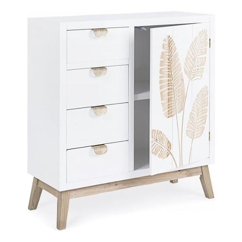 Struttura in abete e MDF, piano e schienale in MDF. Frontale ante e cassetti in abete (con decoro intarsiato a mano) e MDF. Finitura vernice a base d'acqua. Maniglie in acciaio