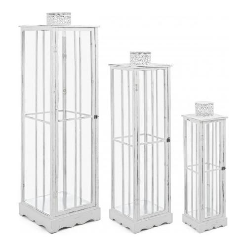 Legno d'abete, ferro battuto verniciato a polvere epossidica e vetro 24x24x90h; 32x32x125h; 40x40x150h cm
