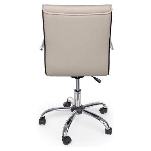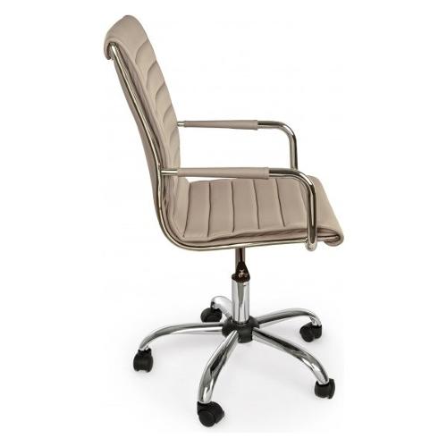 Base in acciaio cromato Ø 56 cm. Ruote in nylon. Seduta e schienale imbottiti e rivestiti in similpelle. Braccioli in acciaio cromato con rivestimento in similpelle. Altezza regolabile