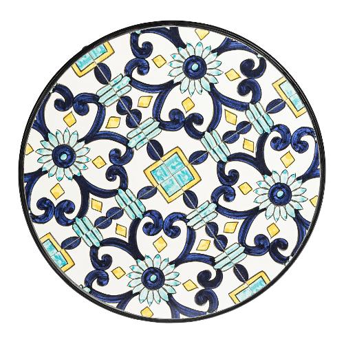 Struttura in acciaio trattato per l'esterno (e-coating) e verniciato a polvere epossidica. Piano, seduta e decori in ceramica. Sedia pieghevole. Tavolo gambe