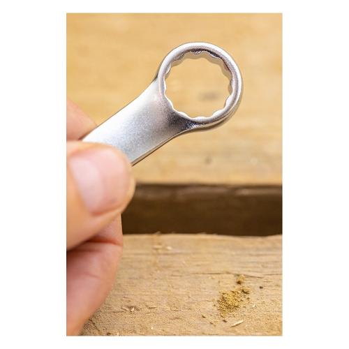 Chiave combinata con profilo che ottimizza il contatto con il bullone, evitando lo scivolamento della chiave. La speciale bocca poligonale piegata di 15° migliora l'accessibilità del bullone