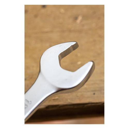 Chiave combinata con profilo che ottimizza il contatto con il bullone, evitando lo scivolamento della chiave. La speciale bocca poligonale piegata di 15° migliora l'accessibilità del bullone