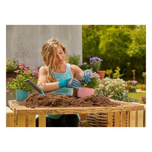 Il giardinaggio è ancora più piacevole con i guanti da giardino e manutenzione di gardena. Questo guanto perfettamente aderente è dotato di molte caratteristiche innovative che facilitano i lavori di giardinaggio leggero e la cura delle piante, come invasare fiori e piante da letto. È adatto per la potatura e la pulizia delle foglie. Il rivestimento in silicone sul palmo della mano dà una grande presa, in modo da avere sempre tutto sotto controllo, il che è particolarmente utile. La parte principale del guanto è costituita da un materiale a rete flessibile e traspirante. Questo è un grande vantaggio, soprattutto durante l'uso prolungato, perché le mani non inizieranno a sudare eccessivamente. Il guanto è dotato di micropile assorbente per il sudore. Si ottiene una perfetta vestibilità grazie al materiale flessibile sul polsino e sul dorso della mano. Se vuoi usare il tuo smartphone o tablet mentre fai giardinaggio, questo non è affatto un problema. Le punte dell'indice e del pollice del guanto per mani grandi hanno la pratica funzione mobile touch per smartphone , così non è necessario togliere il guanto per utilizzare il tuo dispositivo. Inoltre, il guanto da giardino ha ottenuto la certificazione oeko-tex® standard 100, il che significa che i tessuti utilizzati sono privi di sostanze nocive.