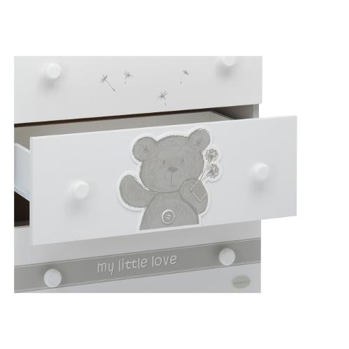 Il tre ampi cassetti sono caratterizzati da un simpatico orsetto in rilievo e dalla scritta con il nome della collezione. Ha ruote gommate antigraffio, con sistema frenante, per facilitare gli spostamenti.