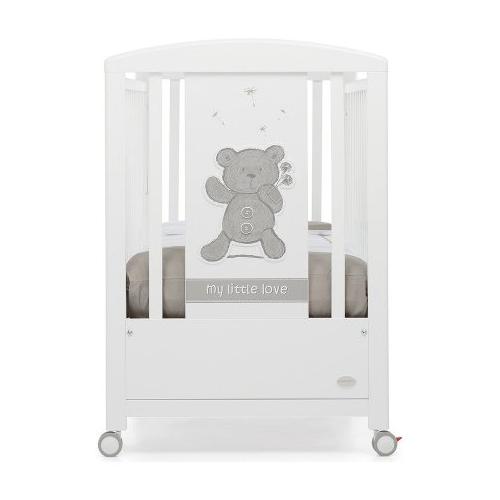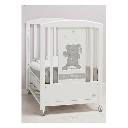 Il lettino in legno My little love di Foppapedretti ha una sponda regolabile a due altezze, per facilitare il riordino del lettino. Inoltre la sponda può essere posizionata sotto il lettino per trasformarlo in un comodo divanetto. Anche la rete è regolabile a due altezze, per consentire un pratico uso anche quando il bimbo è neonato. Una testata del lettino, all’insegna del bianco, è decorata con un simpatico orsetto in rilievo e il nome della collezione. Il lettino ha un ampio cassetto inferiore, suddiviso in due scomparti, e ruote gommate antigraffio, con sistema frenante, per facilitare gli spostamenti. La struttura solida e durevole nel tempo è verniciata con vernici atossiche… ed è 100% made in Italy!