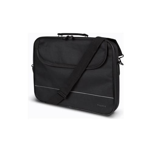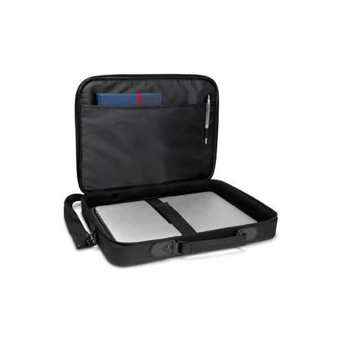 La cerniera perimetrale permette di aprire completamente la borsa e accedere comodamente al vano interno dotato di una robusta imbottitura e di una fascia per il fissaggio del computer.